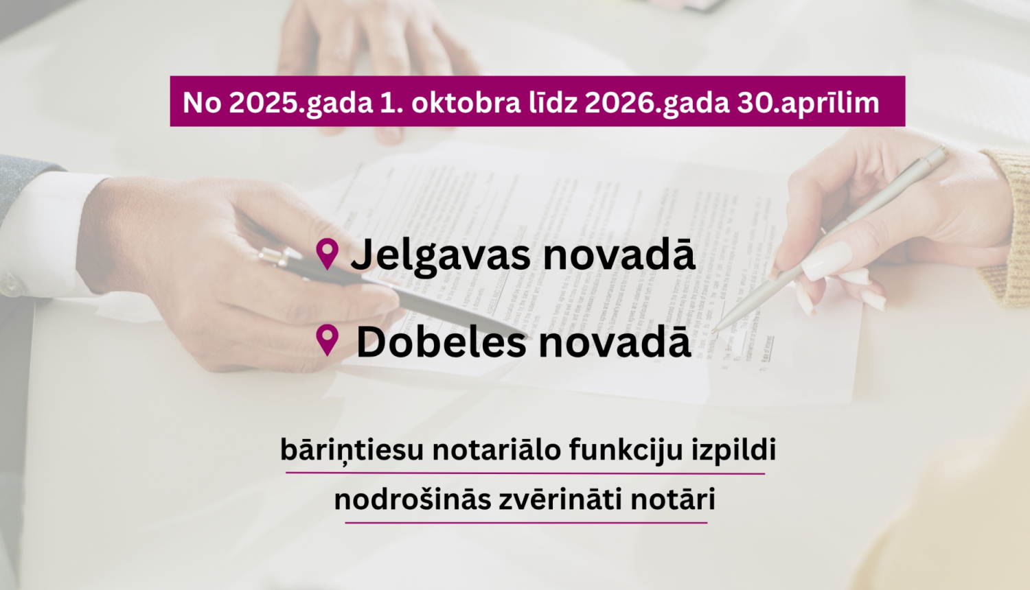 No 2025. gada 1. oktobra līdz pat 2026. gada 31. martam notariālās darbības, kuras Jelgavas un Dobeles novados veica bāriņtiesas, izpildīs zvērināti notāri, kuri praktizē šajos novados.